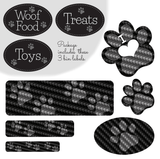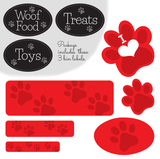Labels can be used on food and treat cannisters, dog crates, leashes and collars, toys, grooming tools and outfits.